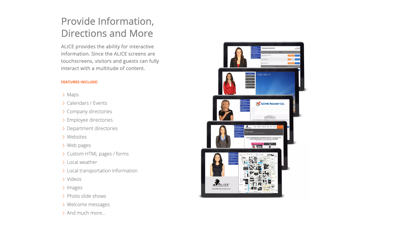 ALICE Receptionist stands out as the premier, comprehensive solution for Visitor Management and Lobby automation on the market. It uniquely employs A.I. video avatars to welcome visitors upon their arrival, guiding them through the check-in process and allowing interaction with staff via live two-way audio and video through the ALICE kiosk.