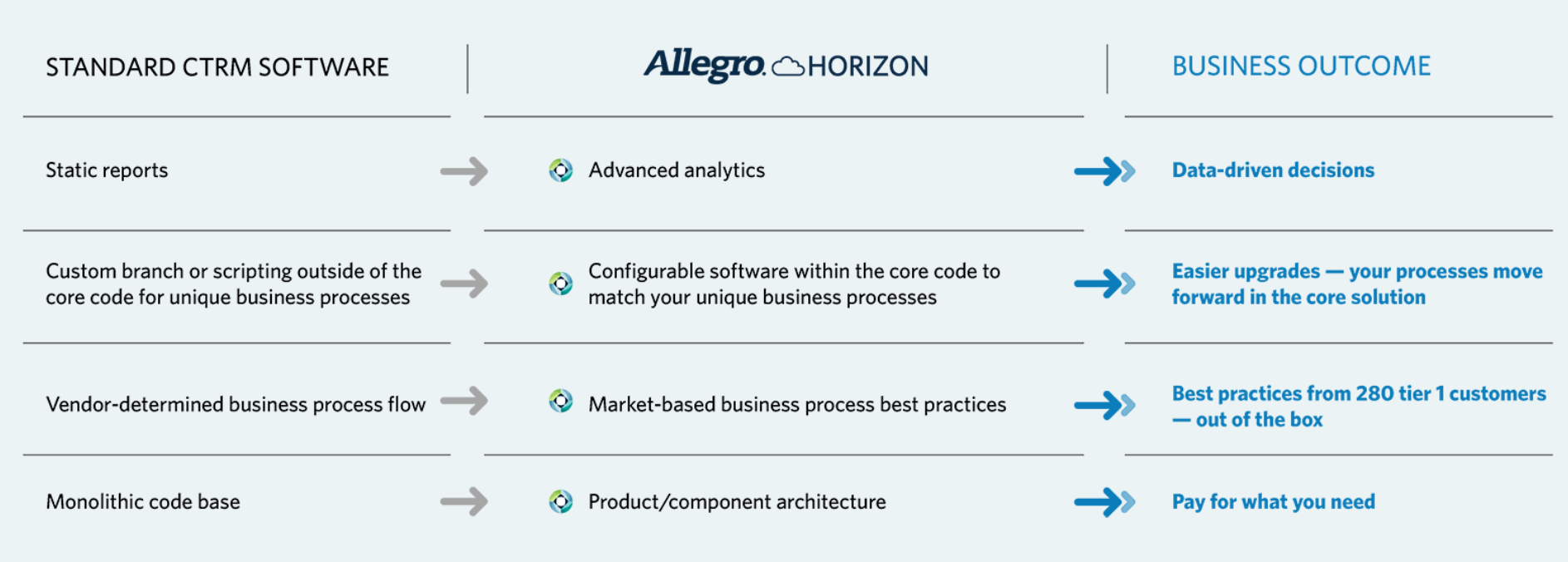Introducing the future of commodity management solutions, Allegro's cutting-edge enterprise CTRM software, along with its sophisticated analytics, empowers commodity companies to make strategic decisions while maintaining complete oversight of their business growth. By leveraging Allegro, clients gain access to data-driven insights that enhance their ability to manage position visibility, risk mitigation, and compliance with regulations. This is made possible through a robust suite of analytics tools designed to deliver top-notch performance. Allegro is dedicated to ongoing innovation in CTRM/ETRM software and advanced analytics, as we strive for excellence beyond the current industry standards. The introduction of Horizon marks a significant advancement for Allegro, harnessing native cloud capabilities to boost efficiency, foster agility, and enable resource optimization. Within just weeks, users can experience the benefits of the cloud-based application, resulting in a notable decrease in capital expenditures, ultimately transforming the way businesses operate. With Allegro, your organization can navigate the complexities of the commodity landscape with confidence and ease.