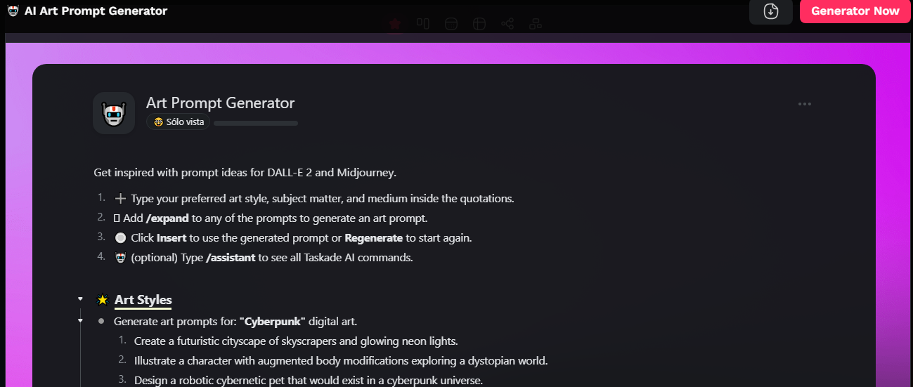 Discover an expansive realm of creativity and boundless possibilities with our innovative Art prompt generator, an outstanding AI-powered tool designed to spark your imagination. Delve into our collection of AI-enhanced productivity tools that streamline your efforts and improve your efficiency, offering solutions that range from drafting succinct meeting summaries to developing detailed to-do lists; our state-of-the-art offerings are tailored to boost your productivity to unprecedented levels. Art is an influential form of self-expression that allows individuals to convey their thoughts, feelings, and life experiences. While it can provide healing, motivation, and fulfillment, even the most creative minds sometimes struggle with a lack of inspiration. This is where art prompt generators, such as Stable Diffusion and DALL-E, become invaluable. By supplying artists and creators with unique and thought-provoking ideas for their future endeavors, these generators serve as powerful catalysts for creativity. These advanced models not only represent significant progress in technology but also possess the ability to inspire upcoming generations of artists to create remarkable and innovative works of art that truly stand out. With the right prompts, anyone can embark on a transformative creative journey, breaking through the confines of artistic block and unlocking their full potential in the process. Ultimately, the fusion of technology and creativity heralds a new era for artistic expression, inviting individuals to explore and harness their unique talents.