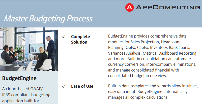 We are excited to present a cloud-driven budgeting platform that fully complies with both GAAP and IFRS regulations, aimed at significantly improving Corporate Performance Management. This solution eliminates the need for old-fashioned spreadsheets that require constant formula modifications and obstruct efficient team collaboration. BudgetEngine delivers a comprehensive, intuitive interface that encourages seamless teamwork. With built-in data templates and simple wizards, entering data is a hassle-free experience. The application also manages all complex calculations on its own. Additionally, it offers tailored access permissions linked to user roles (Full Edit, Read Only, No Access) for each functionality and budget dataset, ensuring security and control. Typically, the setup of BudgetEngine can be completed in less than a day, and users usually need little to no training to use the system proficiently. This cutting-edge tool is poised to revolutionize how teams handle budgeting and financial strategy, ultimately leading to enhanced efficiency and productivity in the financial planning process.