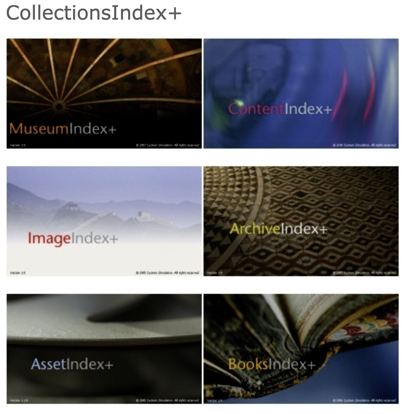 CollectionsIndex+ is a dynamic software platform tailored for the organization of diverse collections and content types, ranging from objects and archives to books, images, videos, digital assets, and various web and gallery materials. The System Simulation suite presents an extensive array of management solutions, featuring specialized tools like BooksIndex+ for books, ArchiveIndex+ for archives, and MuseumIndex+ for museum artifacts. Moreover, we offer strong enterprise-level solutions for overseeing digital images and assets through tools such as ImageIndex+ and AssetIndex+. These products can function independently or in conjunction with one another, forming a unified and robust suite of integrated modules that significantly enhance overall operational efficiency. This adaptability empowers users to tailor their collection management processes to fit their unique requirements and workflows, thereby improving productivity and organization in their respective fields. Additionally, the platform is designed to evolve alongside technological advancements, ensuring that it remains relevant and effective in meeting the changing needs of its users.