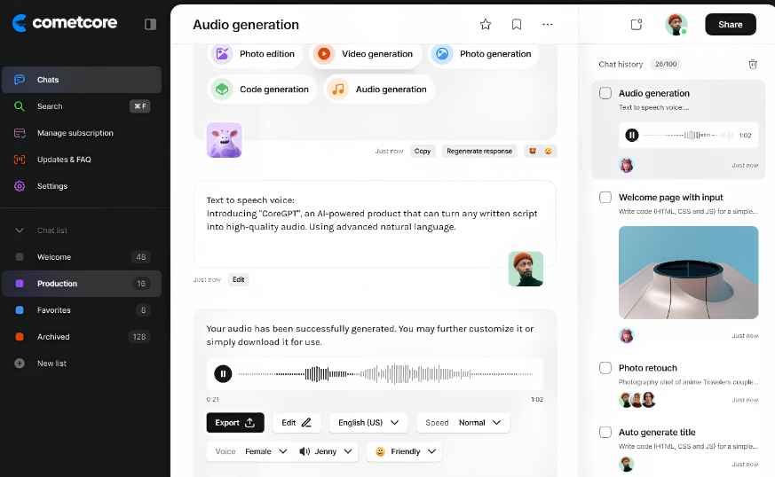 CometCore presents a cutting-edge, automated chat solution powered by AI, tailored for a wide range of multimedia, coding, and content creation activities in various digital formats. This innovative platform is designed to empower creators by providing them with sophisticated AI chat and coding tools. With the integration of GPT-4 automation, users can easily create customized AI agents that streamline daily tasks and enhance productivity through simple, intuitive commands. These personalized AI assistants can handle a variety of functions, such as making reservations, grocery shopping, and much more, which ultimately increases efficiency and simplifies everyday life. Dive into the realm of AI-enhanced task management and transform the way you manage your daily responsibilities. Interact with GPT-4 through both text and voice commands in any language, as our platform seamlessly adapts to your preferred mode of communication, breaking down language barriers and providing effortless access to powerful AI features. Explore the dynamic capabilities of AI agents designed to boost productivity and improve communication, all encapsulated within CometCore's extensive collection of AI-driven creative resources, specifically developed to cater to the ever-changing demands of users in today’s digital age. As you engage with these tools, you will discover new ways to optimize your workflow and achieve your creative goals.