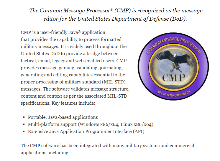 CMP is a user-friendly Java® application that efficiently processes military messages in a structured manner. This essential tool is utilized by the United States Department of Defense, enabling seamless communication among tactical users, email systems, legacy platforms, and web interfaces. The application includes functions for parsing, validating, journaling, generating, and editing military standard (MIL-STD) messages, ensuring compliance with the required protocols. CMP carefully evaluates the structure, content, and context of each message in accordance with the applicable MIL-STD specifications. Designed for portability, this software works across various platforms, such as Windows x86/x64 and Linux x86/x64. Additionally, it features a detailed Java Application Programmer Interface (API) tailored for developers' needs. CMP has successfully passed independent validation through Conformance to Standards (CTS) assessments carried out by the Joint Interoperability Test Command (JITC), which reinforces its dependability. The application also maintains backward compatibility with current systems by accommodating various MIL-STD headers and multiple message baselines, including annual updates, thus increasing its value in military communications. With its extensive capabilities, CMP proves to be an indispensable asset for ensuring effective and standardized messaging in military operations, while also adapting to evolving technological needs.