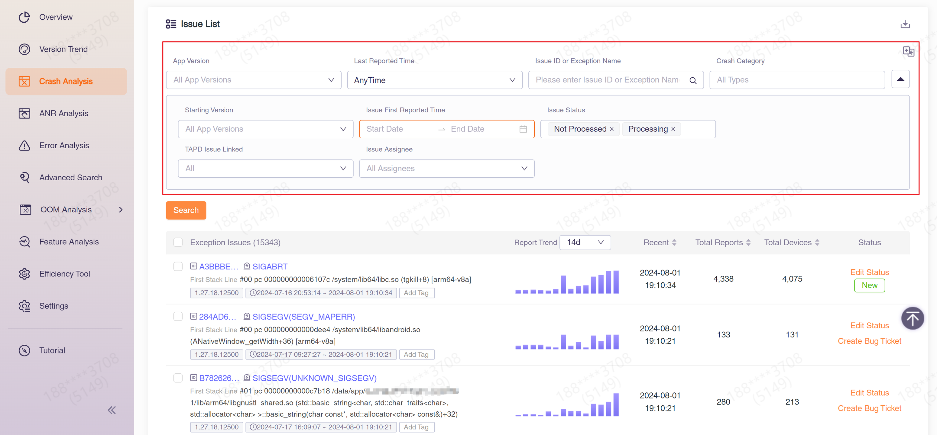 At its core, CrashSight detects four types of exceptions — crashes, ANRs, script-level errors, and out-of-memory issues — and automatically classifies them into trackable issues with occurrence counts, affected device metrics, and reporting trends. Every crash report includes rich diagnostic data: error stacks, trace logs, register information, loaded libraries, and system logs.