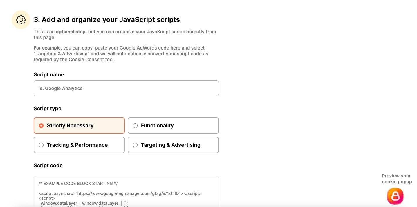 Begin by selecting your compliance preferences and tailoring your cookie consent accordingly. Then, simply copy the code onto your website; it might even be faster than preparing a meal!