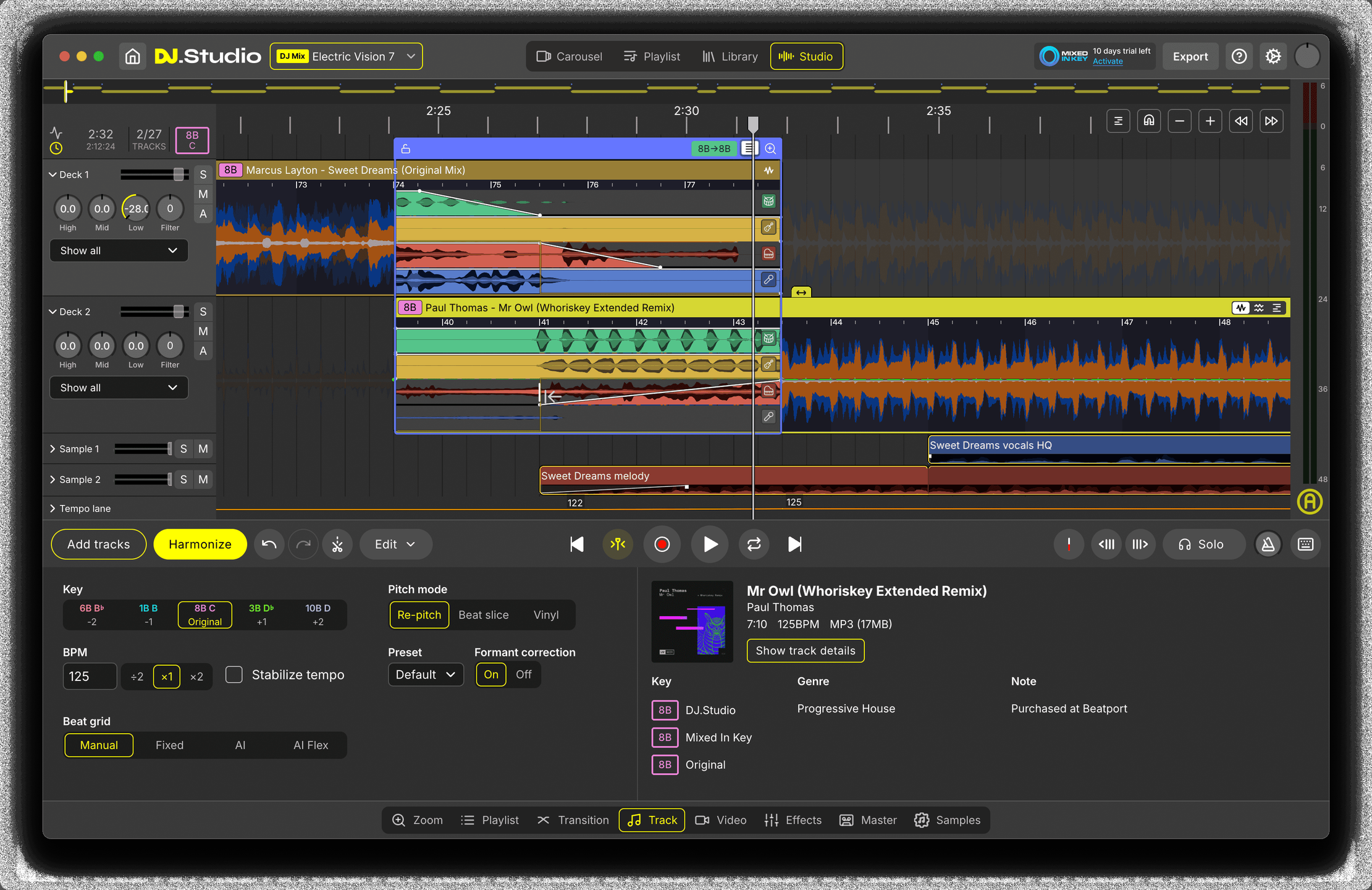 The timeline editor lets you dial in transitions, stack tracks, and shape the flow exactly the way you want. Harmonize analyzes tempo and key to create smooth, harmonically matched playlists in seconds. With stem separation, you can split vocals, drums, bass, and melodies to craft mashups and cleaner transitions.