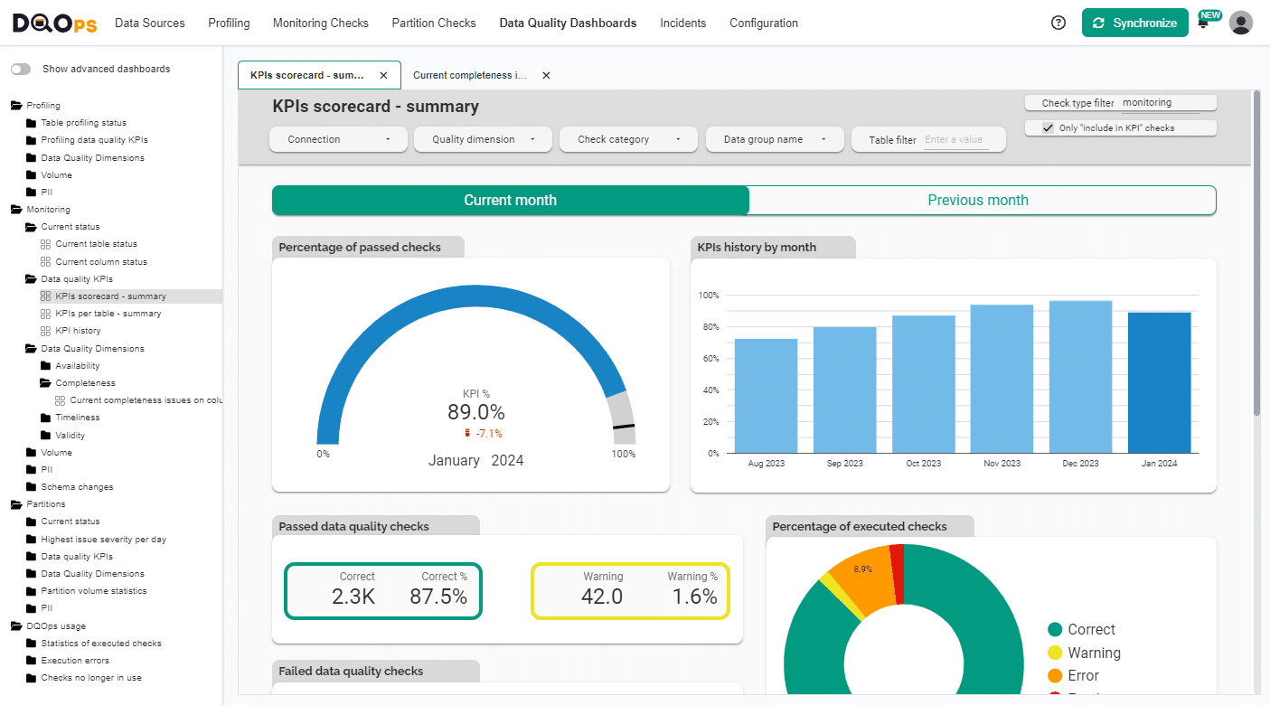 DQOps serves as a comprehensive platform for monitoring data quality, specifically designed for data teams to identify and resolve quality concerns before they can adversely affect business operations. With its user-friendly dashboards, users can track key performance indicators related to data quality, ultimately striving for a perfect score of 100%.