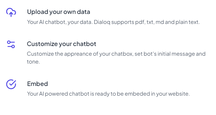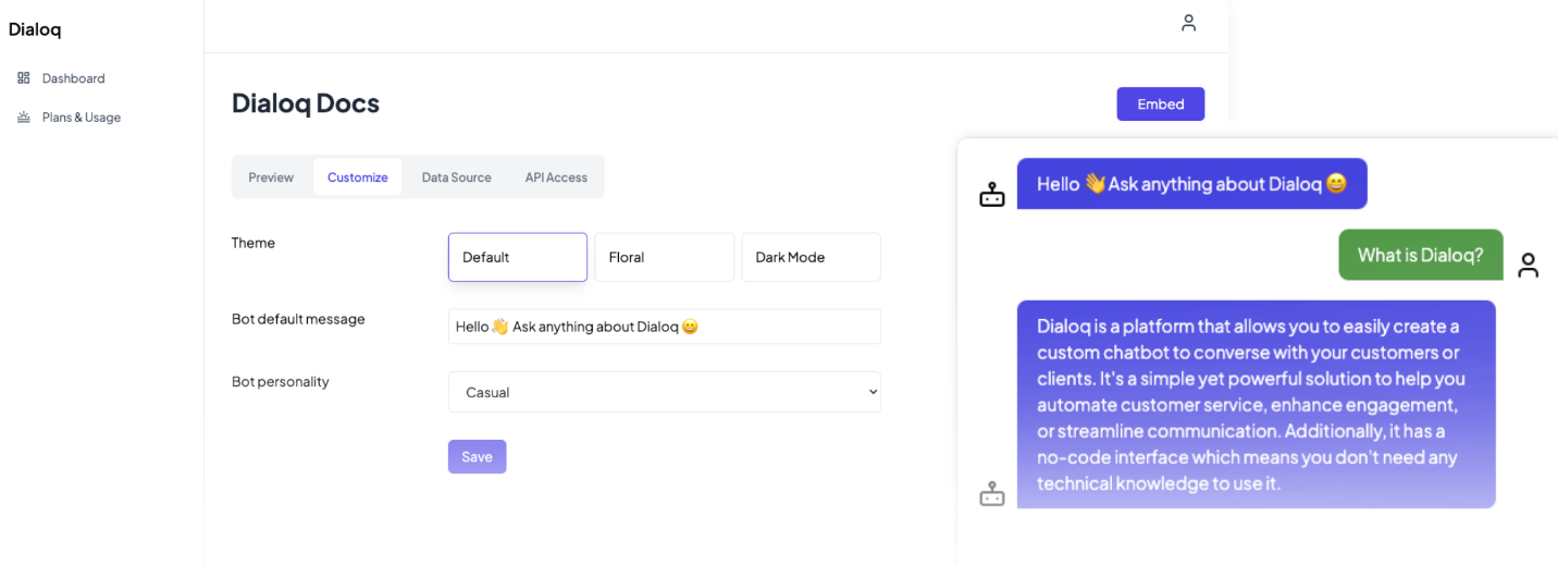 Developing a chatbot powered by AI through Dialoq is an easy task that doesn't necessitate any programming knowledge. You can customize the look of your chat interface while also setting the welcome message and the conversational tone of your bot. After completing these uncomplicated steps, your chatbot will be ready for seamless integration into your website. Dialoq uses a message credit system to monitor the number of messages your chatbot can send each month, with each dispatched message costing one credit from your total allowance. Furthermore, there is a character credit limitation that governs the cumulative number of characters you can input into your data, which is applicable to all chatbots you have created. Once you've adequately trained your chatbot, it can be embedded using either iframe or JavaScript methods. You also have the flexibility to select a theme for your chat interface, set its introductory message, and shape the chatbot's personality traits to improve user engagement. Overall, the user-friendly interface provided by Dialoq makes it easy to craft a functional and captivating chatbot experience, while also allowing for further customization as your needs evolve. With these features, Dialoq ensures that anyone can create a tailored chatbot that resonates with their audience.