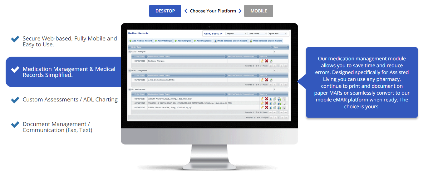 MedRightMedRight is a cost-efficient, fully supported, and user-friendly EHR/eMAR solution designed for senior living communities such as Assisted Living Facilities (ALFs) and Skilled Nursing Facilities (SNFs). Its adaptable configuration allows use in various settings, including treatment centers and facilities for individuals with developmental disabilities (IDDs). MedRight prioritizes patient safety and adheres to HIPAA compliance, making it a trusted choice across the nation. It encompasses a comprehensive array of features necessary for effective management of any senior living community, including but not limited to: - Inventory Tracking - e-Narcotic Logs - eMAR - Comprehensive Reporting - Seizure and Behavior Tracking - Incident Documentation - Staff and Resident Management - Care Plans and Assessments - Community and Resident Calendars - Vital Signs Tracking and Graphing - e-Prescribing - Refusal Log - Notifications via Text/Email - Document Management - Alerts and Trends - Pharmacy Integration - Offline Functionality - Standing Orders - Family Communication via Email Blasts - Family Portal Access - Customized CRM - Activities of Daily Living (ADL) Tracking - Wound Management - Staff Licensing and Training Oversight - Key Performance Indicators (KPI) Dashboard - Cloud-Based and Web Accessible Our commitment to healthcare interoperability is reinforced through seamless integration with other healthcare providers via our API. Interested parties can schedule a demo or take advantage of MedRight's complimentary trial.