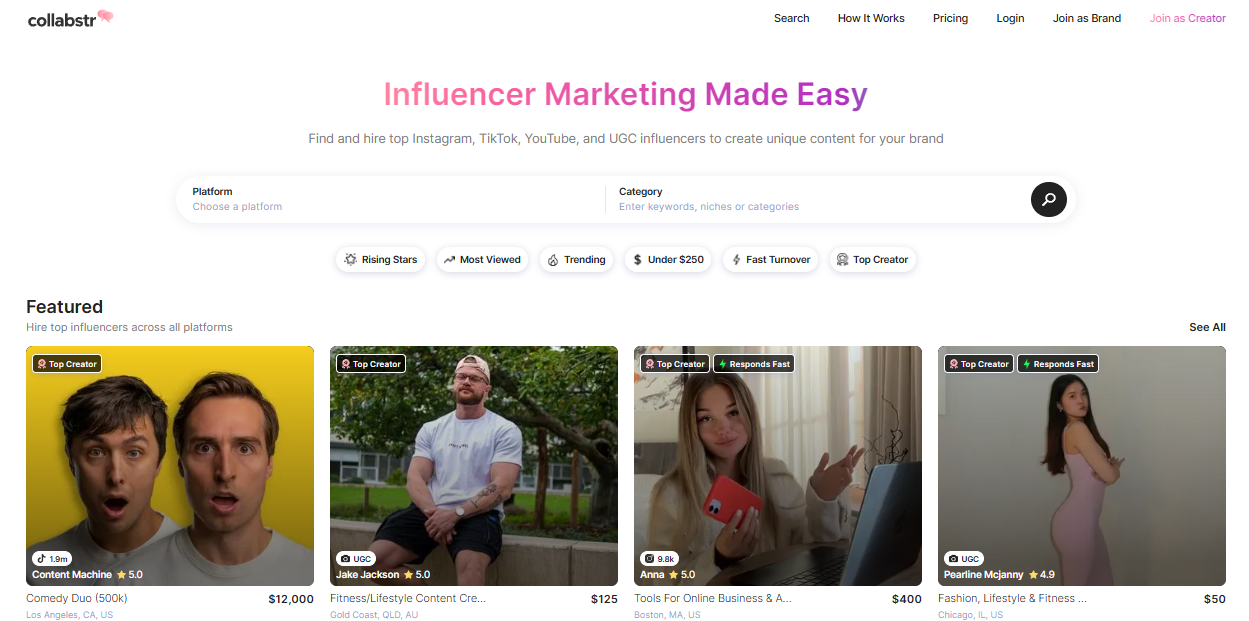 Collabstr functions as an influencer marketing hub, simplifying the process for brands to connect with creators by providing access to a wide range of verified influencers across platforms like Instagram, TikTok, YouTube, Twitter, Twitch, Amazon, and UGC, with the ability to filter by niche, location, follower count, and other criteria; the platform ensures secure transactions with funds held in escrow until the content is approved. Brands can easily disseminate campaign briefs to a variety of creators, evaluate applications that detail pricing, and choose their ideal partners, all while leveraging automated, one-click analytics to track real-time impressions, engagement, and the overall success of their campaigns. There are no upfront costs, subscriptions, contracts, or hidden fees, ensuring that the entire process of searching for and hiring talent remains completely free. Influencers are verified through a detailed examination of their social interactions and previous brand collaborations, while the platform also supports secure communication, customized offers, shipping coordination, and efficient campaign management, thus removing the necessity for additional tools. Furthermore, this intuitive service creates an engaging atmosphere that promotes collaboration and sparks creativity between brands and influencers, ultimately benefiting both parties.