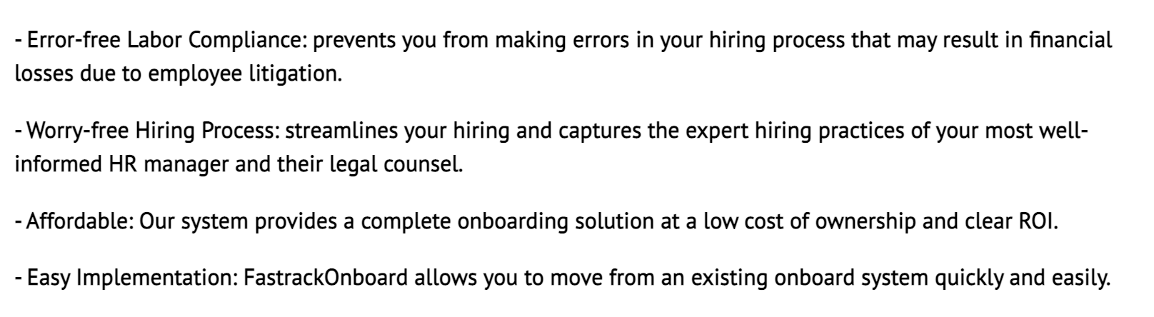FastrackOnBoard is a sleek and efficient onboarding software designed for rapidly growing companies. This innovative tool safeguards your investments and reduces the risk of legal issues. Additionally, it facilitates adherence to all employer regulations from the moment you welcome a new team member. By replacing cumbersome manual procedures, FastrackOnBoard offers a user-friendly experience for your staff. Furthermore, it encompasses all the necessary features to streamline and manage your compliance processes effectively. With FastrackOnBoard, onboarding becomes not just a task, but a seamless experience that enhances organizational efficiency.