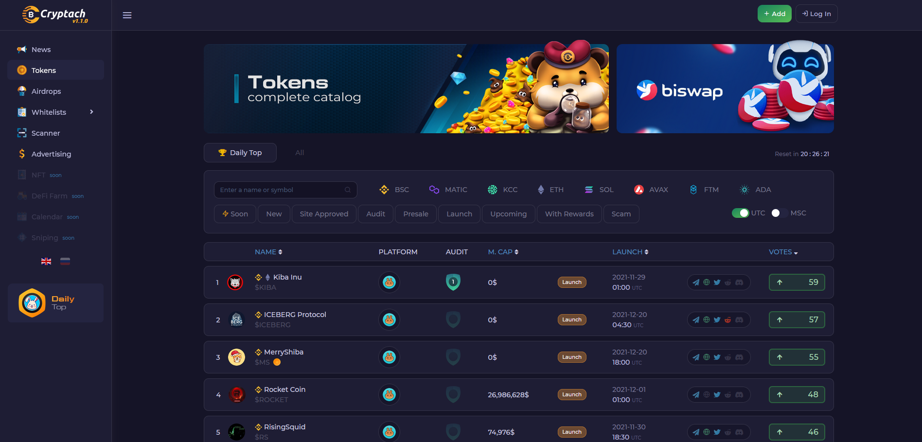 An extensive variety of tokens is available, including DeFi projects, NFTs, whitelists, IDOs, gems, shield audits, and other token offerings, along with options for presales and fair launches. The Contract Checker is a tool designed to assess contracts for potential honeypot schemes or rug pulls. Additionally, there is a vast selection of altcoins from various networks, with features like sniping, bots, airdrops, and GameFi opportunities. This platform caters to a diverse array of cryptocurrency enthusiasts seeking to explore innovative investment possibilities.