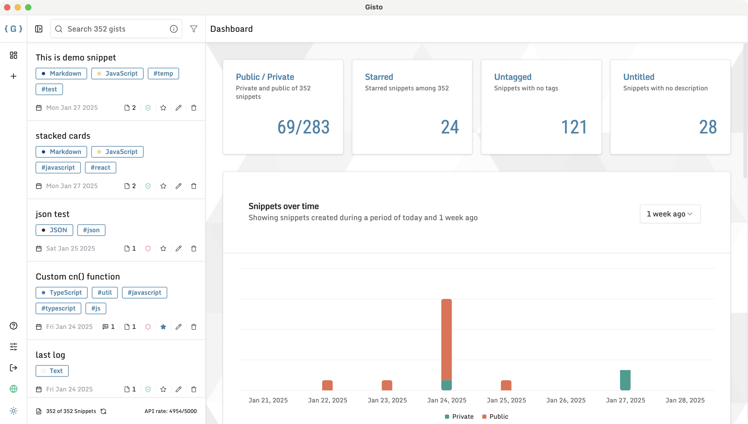 Gisto serves as a management tool for code snippets that operates on GitHub Gists, enhancing the experience with features such as advanced searching, tagging, and sharing capabilities, alongside a sophisticated rich editor. All your data remains securely stored on GitHub, ensuring you can access it through GitHub Gists at any time, with any modifications made in Gisto being automatically synchronized. This tool incorporates an open-source Monaco editor, which supports a wide range of functionalities including syntax highlighting, auto-completion, and Emmet, making it easier to work on your Gists. Users can swiftly locate their gists using the search feature, which allows for filtering by description, file names, tags, languages, and more. Gisto also provides the functionality to tag Gists with custom labels, streamlining the process of finding snippets later on. By simply adding a hashtag to the snippet title, users can easily retrieve it by entering the hashtag into the search bar or by utilizing the tag list available on the dashboard. Designed to address the need for a robust code snippet solution, Gisto ensures that your code is both syntax-highlighted and synchronized in the cloud, making the coding process more efficient and organized. With Gisto, developers can significantly enhance their workflow, ensuring that their snippets are stored and accessible whenever needed.
