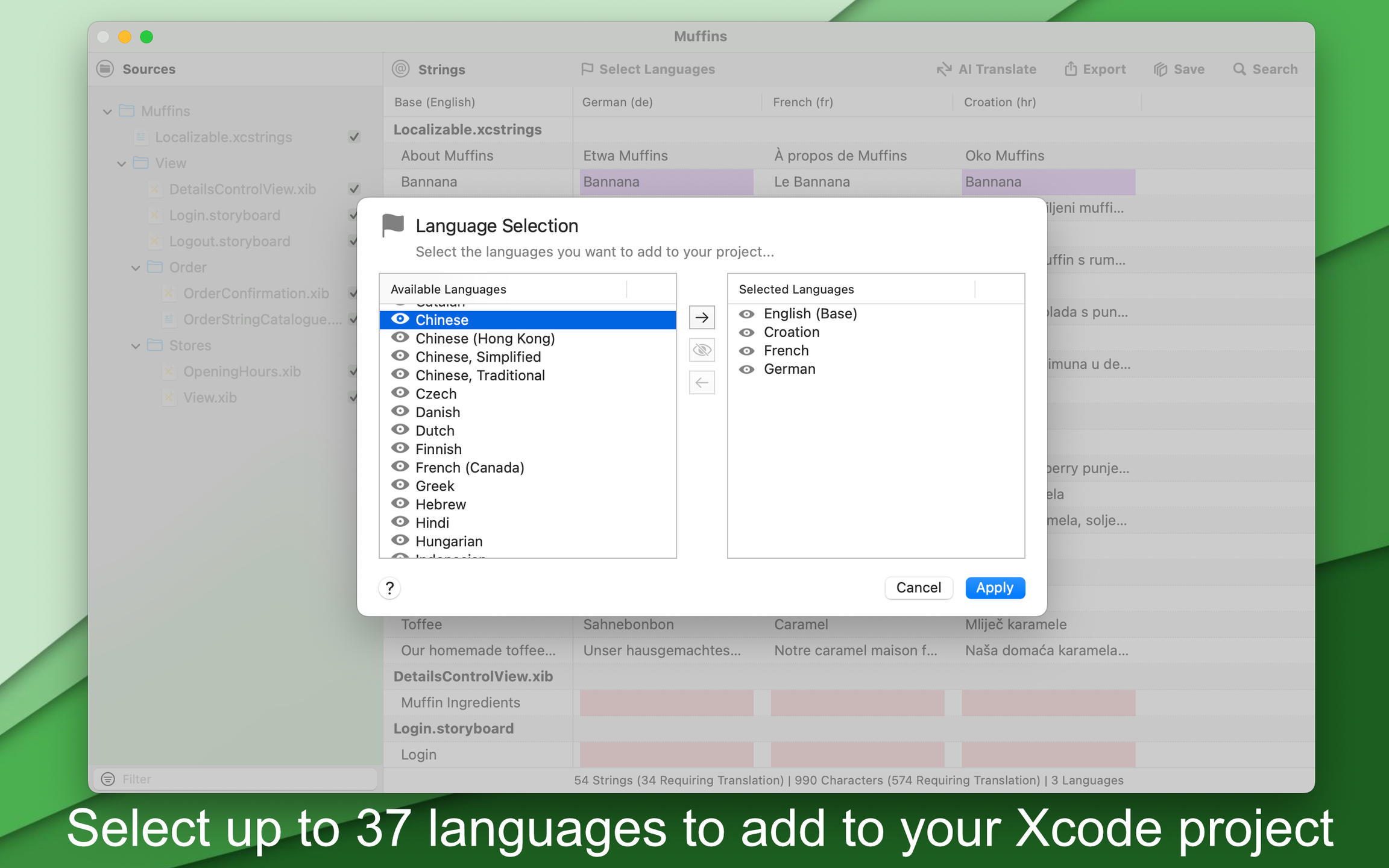 - Localize strings for SwiftUI, Storyboard, or XIB interfaces, with support for both .strings and .xcstrings file formats.