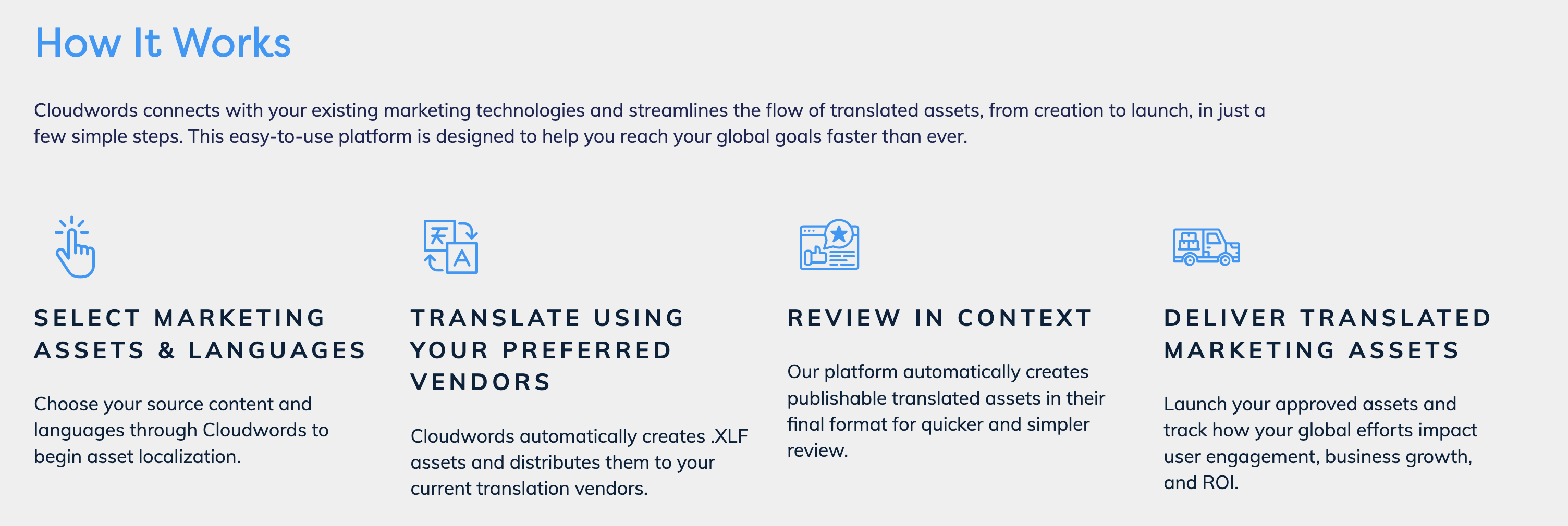 Cloudwords offers a seamless connection with your current marketing technologies, simplifying the management of translated assets from the initial stages to their final launch in just a few straightforward steps. This intuitive platform is designed to accelerate your journey toward achieving international goals effectively. Start by choosing your source material and preferred languages within Cloudwords to kick off the localization process. The platform swiftly generates .XLF files and sends them to your selected translation vendors, ensuring a streamlined workflow. Furthermore, Cloudwords automatically creates final translated assets, simplifying the review process for quicker approvals. After securing approvals, you can roll out your assets and track the impact of your global initiatives on user engagement, business growth, and return on investment. By incorporating Cloudwords into your existing technology framework, we elevate its functionality through the smart automation features of the localization platform. This integration is both fast and uncomplicated, granting you prompt access to the benefits of automation in localization and translation management, which ultimately revolutionizes your global marketing approach. Embrace the future of localization with Cloudwords and witness a significant enhancement in both the efficiency and effectiveness of your marketing campaigns. With Cloudwords, you can ensure that your global outreach is not only impactful but also strategically aligned with your business goals.