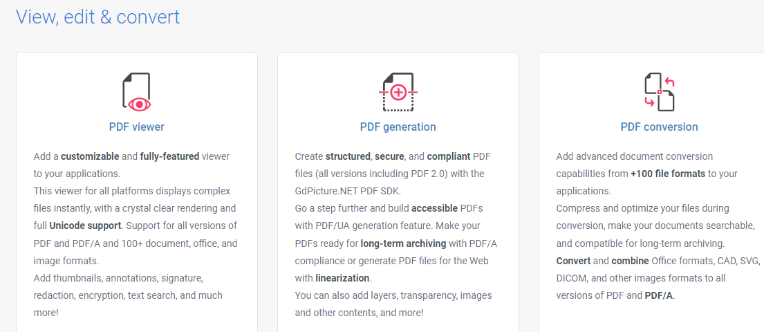 GdPicture.NET PDFSDK offers a user-friendly API that enables developers to build highly customizable applications across various software environments. With this SDK, you can integrate a feature-rich viewer that works seamlessly on all platforms, efficiently rendering complex documents while ensuring full Unicode support. It supports all versions of PDF and PDF/A, along with over 100 different document, office, and image formats. You have the capability to incorporate functionalities such as thumbnails, annotations, and digital signatures. In addition, it provides essential features for redaction, encryption, and text search, among others. GdPicture.NET PDFSDK empowers you to produce compliant, organized, and secure PDF documents, including the latest PDF 2.0 standards. Furthermore, you can create accessible PDFs through its PDF/UA generation capabilities, which cater to users with disabilities. For long-term archiving, you can ensure that your PDFs meet PDF/A compliance, while also having the option to generate web-optimized PDF files using linearization techniques. Additionally, you can enhance your documents by adding layers and transparency to various content elements, enriching the overall user experience. This versatility makes GdPicture.NET PDFSDK an essential tool for developers seeking to elevate their software solutions.