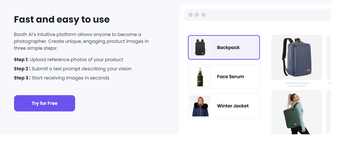 Easily create breathtaking lifestyle photos by specifying your desired shot and including example product images. Think of Booth AI as your personal photographer, who understands your brand's essence and is always ready to assist! With the power of generative AI, you can harness sophisticated machine learning to turn your creative concepts into tangible visuals. By incorporating reference images, you can craft new, original graphics that resonate with your brand, vision, and purpose. As long as you can describe it, Booth AI is prepared to bring it to life. Unleash your imagination and see your ideas materialize before your eyes! This innovative approach not only enhances your creative process but also ensures that your visuals stand out in today's competitive market.