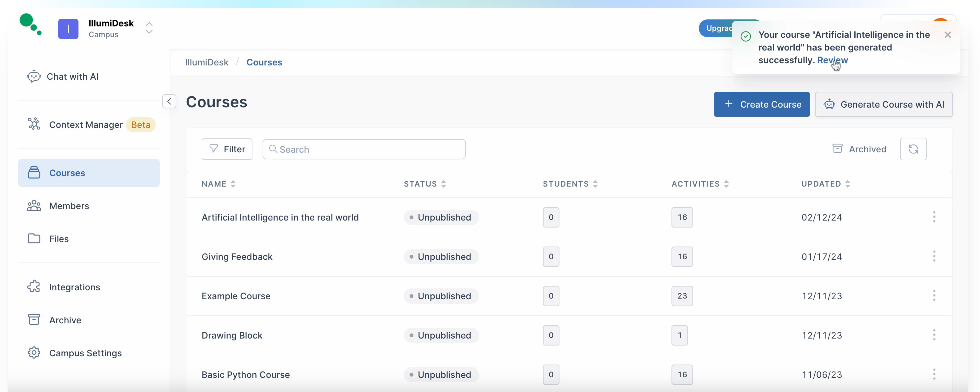 Enhance your grading methods and provide prompt feedback to your students. Foster engagement with learners via discussion boards, mentions, and inline comments, creating a collaborative educational atmosphere. With the advent of real-time collaboration, IllumiDesk's AI will support you in crafting, organizing, and converting your materials into captivating interactive lessons. Its flexible integration options via RESTful API and LTI v1.3 enable you to seamlessly incorporate your current resources and workflows. Now, you can create outstanding courses in just minutes instead of stretching the endeavor over months. Engage your audience with appealing content without investing endless hours. Whether opting to tailor a course with only a few clicks or constructing one from the ground up, IllumiDesk simplifies the process for you. By leveraging IllumiDesk's diverse integration capabilities, you can effectively enhance your existing content processes. This platform proves to be an invaluable resource for educators and content developers, allowing teams to efficiently create and monetize top-notch educational resources. Ultimately, IllumiDesk revolutionizes the way you approach course design and material creation, enabling a more effective learning experience for all.