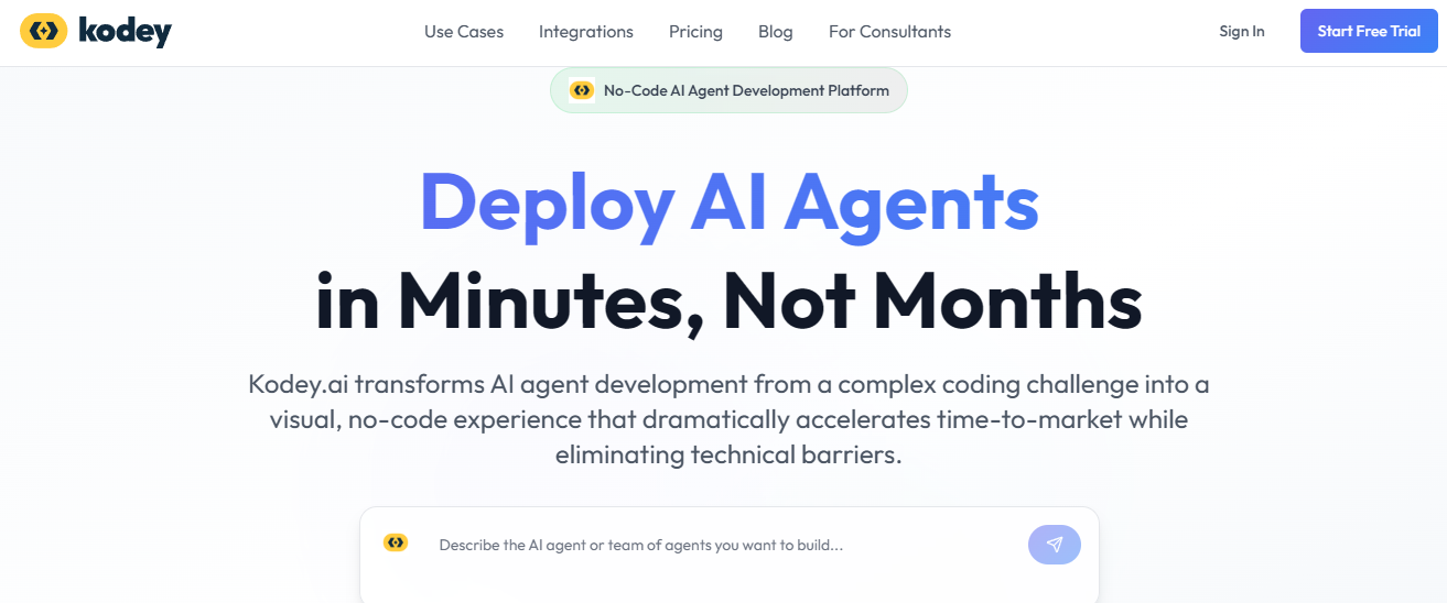 Kodey is a flexible AI-agent platform that empowers users to design, implement, and manage autonomous AI agents without needing any programming skills. With its user-friendly visual builder, non-technical individuals can quickly drag and drop components and establish workflows or connect data sources in mere minutes; developers looking for deeper customization have access to extensive SDKs and APIs, including Python, JavaScript, and REST/GraphQL. Once configured, these agents run in secure, containerized environments and can be launched in production via REST, WebSocket, or as embedded web components, while Kodey.ai automatically scales the infrastructure to meet fluctuating needs. Additionally, the platform is furnished with ready-to-use integrations for various databases and third-party services, along with features for real-time monitoring, analytics, version management, and collaborative tools that incorporate role-based access control, ensuring that production workflows remain reliable, secure, and easy to maintain. By allowing users to concentrate on creativity and innovation, Kodey effectively manages the intricate aspects of deploying AI technologies. This streamlined approach not only enhances productivity but also significantly reduces the time and effort required to bring AI solutions to life.