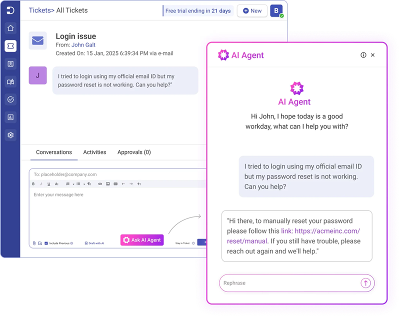 Desk365 is an AI-powered ticketing system for teams of all sizes. The platform empowers agents to enhance productivity, automate workflows, and deliver exceptional customer experiences.