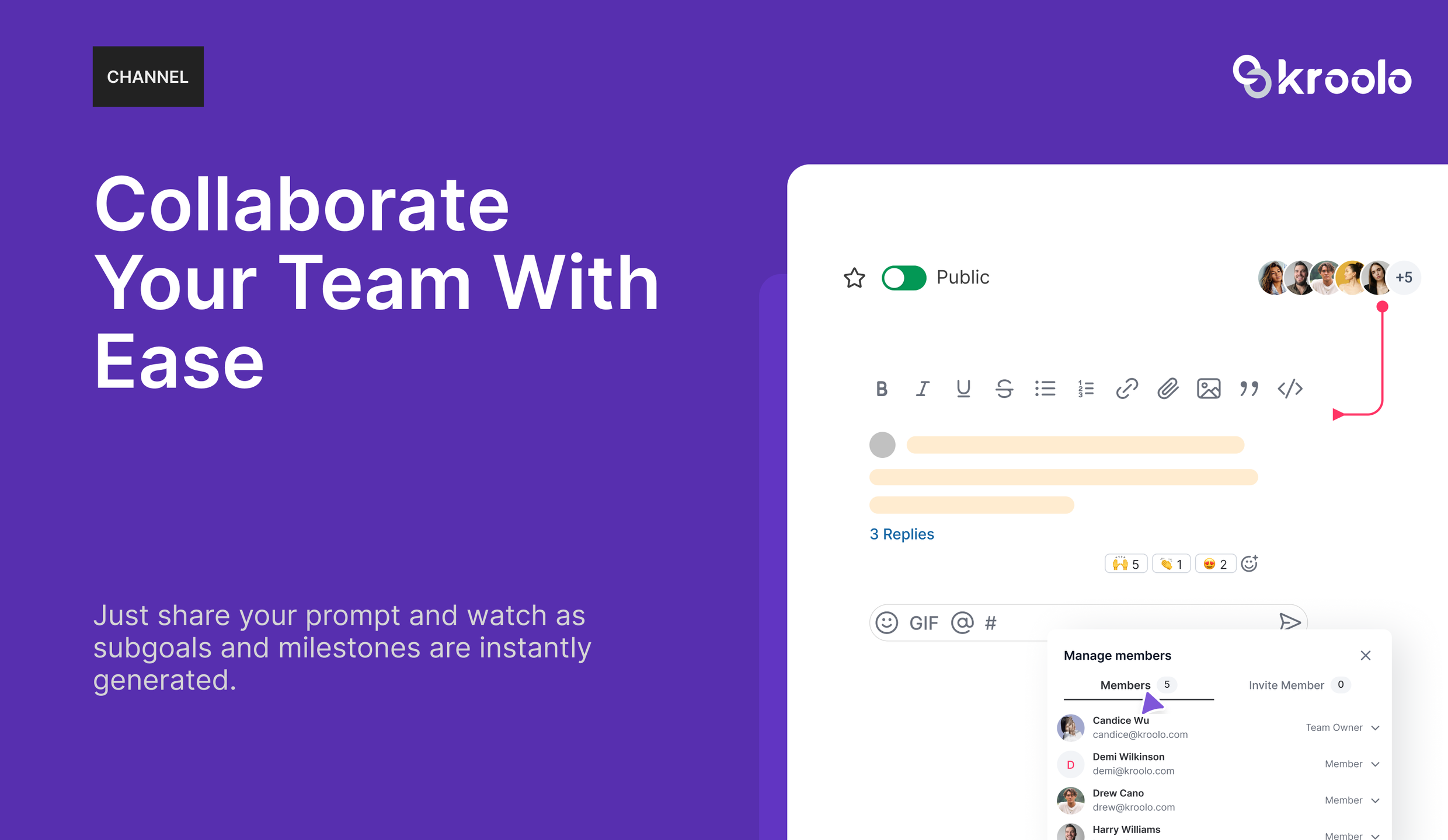 With Kroolo, you can unify all your objectives, tasks, and OKRs metrics on a single dashboard, providing you with a streamlined view of your ambitions. Beyond being a mere project management solution, Kroolo serves as your essential online team management software. Its channels simplify the process of inviting team members to collaborate on various tasks, documents, or projects effortlessly.