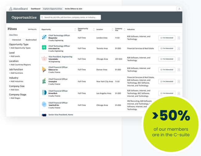 AboveBoard is committed to improving access to board positions and executive roles for individuals from underrepresented backgrounds while simultaneously expanding employer access to talented candidates. Our platform showcases over 500 leadership opportunities across diverse sectors, including both public and private enterprises, as well as Private Equity and Venture Capital portfolio firms. By becoming a member, executives receive free access to a multitude of job prospects and can carry out their searches with total discretion. This initiative empowers companies to connect with previously untapped networks of well-qualified, diverse leaders. Our community encompasses more than 4,000 high-caliber professionals from numerous industries and specialties, such as Finance, Marketing, Sales, Product Development, and Operations. The AboveBoard network is further enhanced by collaboration with investment firms, their portfolio entities, recruitment agencies, and organizations that advocate for underrepresented executives, all working together to promote a leadership environment that is more inclusive and diverse. Through these connections, we strive to initiate a positive ripple effect that elevates representation within the upper echelons of organizations and drives meaningful change across the corporate landscape.