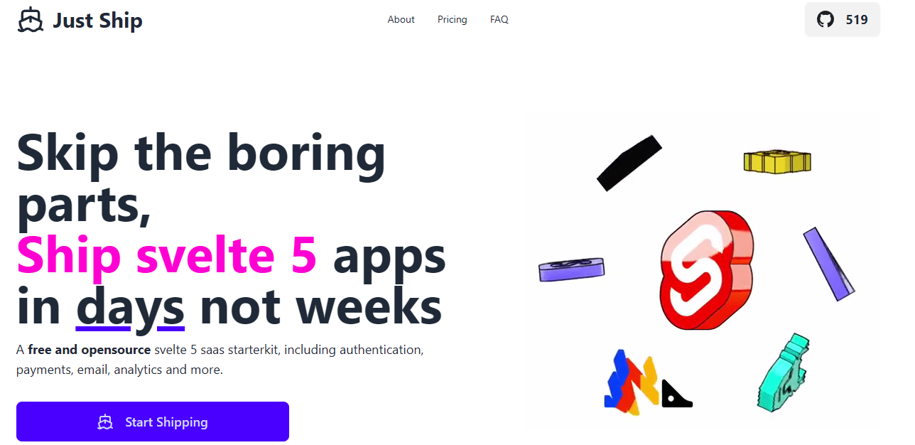 Just Ship is a fully free and open-source SaaS starter kit designed with Svelte 5 and SvelteKit, focusing on simplifying the web application development process by providing a variety of essential features from the outset. It includes user authentication options like magic links and Google social login, while ensuring that user data is safely stored in a Turso database. With over 30 pre-designed styles powered by daisyUI, the kit supports dark mode and offers numerous landing page components that facilitate rapid UI development. Integrated payment processing through Stripe allows developers to accept payments seamlessly and manage webhooks effortlessly. For analytics, PostHog is utilized, featuring configurations to bypass ad blockers by using Vercel as a proxy, along with capabilities for A/B testing and feature flag management to enhance user engagement. Additionally, it streamlines SEO tag management through its load function and supports email communications via Postmark, while deployment is made straightforward through Vercel, presenting a comprehensive toolkit for developers aiming to launch their applications with ease. This all-inclusive solution not only speeds up the development timeline but also equips developers with powerful resources to build dynamic web experiences, ensuring they can focus on innovation and user satisfaction.