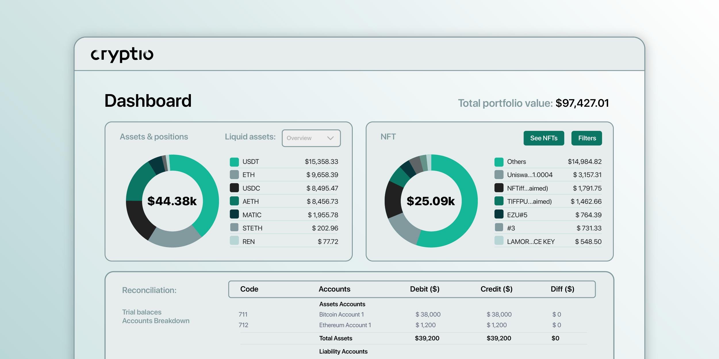 Our software empowers crypto-native financial institutions, accountants, auditors, and other financial entities to confidently navigate the complex and often fragmented digital asset environment.