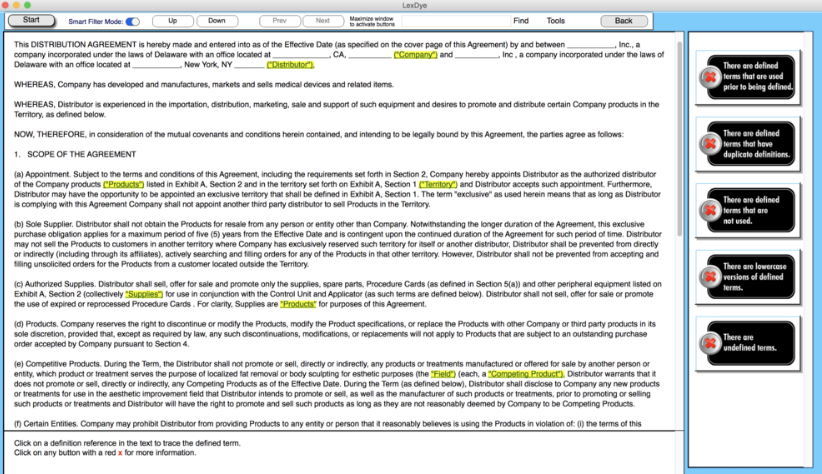 LexDye focuses on developing analytical software tailored for legal professionals, enabling them to fully understand contracts during the drafting process. Our cutting-edge tools "dye" the text in a document, pinpointing potential drafting errors and ensuring that the final product reflects the drafter's original intentions. The LexDye Definition Tracker can be easily installed on a user’s computer, whether it's part of a secure network or a virtual desktop, and it performs all analyses locally, ensuring that no documents are stored, thereby safeguarding confidentiality. With no need for internet connectivity or cloud services, our software secures your documents while maintaining privacy. We recognize that while software cannot replace a drafter's expertise, especially with complex legal texts, our tools are crafted to enhance the drafting experience by providing insights that standard word processors lack. By utilizing our technology, legal professionals can refine their contract drafting process and keep full control over their sensitive data, ultimately increasing their efficiency and accuracy in legal documentation. Additionally, LexDye's commitment to user security and document integrity sets it apart in the field of legal technology.