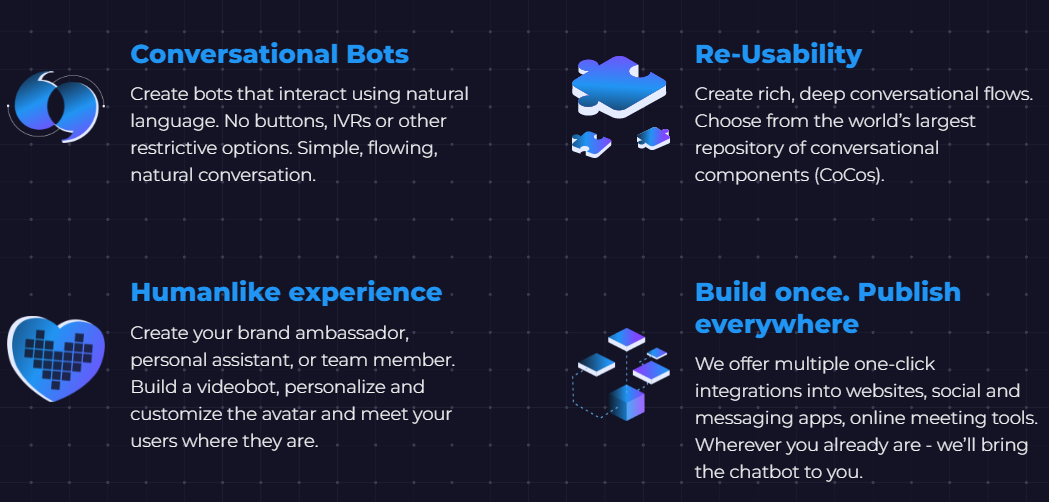 Create engaging bots for video conferencing tools like Zoom, Google Meet, and Facetime in mere minutes, all without requiring any programming skills; simply craft the dialogue. These bots facilitate interactions in natural language, removing the necessity for buttons or IVRs, resulting in a fluid and authentic conversational flow. You can build complex and significant conversational pathways by utilizing the most extensive repository of conversational components (CoCos) accessible worldwide. Design your unique brand ambassador, personal assistant, or virtual colleague, and develop a video bot by tailoring the avatar for effective user connection. We offer a plethora of one-click integrations with various websites, social media platforms, messaging services, and online meeting applications, ensuring that we can reach your audience wherever they may be. Effortlessly create and deploy your own video, voice, or text bot, providing a unified experience for your audience while simultaneously reducing your team's workload. These advanced features not only boost user engagement but also optimize communication processes, making it simpler than ever to establish a connection with your desired audience. Additionally, the versatility of these bots allows for continuous improvement and adaptation to meet evolving user needs.