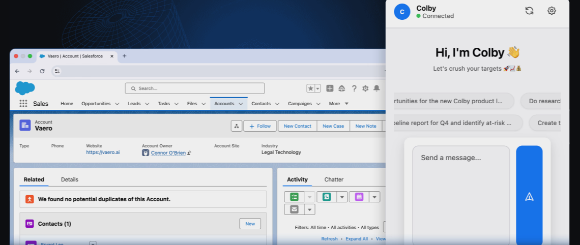 Colby is a cutting-edge sales assistant powered by AI, available as a Chrome extension that simplifies the management of Salesforce data through natural language and voice commands. It performs online research on prospective clients, enhances lead information, updates and inputs contact details, records meeting notes, sets reminders, and executes bulk data modifications in Salesforce within a minute, achieving speeds that are up to 120 times quicker than traditional methods involving reports and Excel. Engineered for seamless integration, Colby operates solely as a browser add-on and does not require training, as it instinctively grasps the Salesforce context and data sourced from the web, enabling it to efficiently fill opportunities and client profiles complete with inline citations. Its sophisticated AI algorithms deliver real-time market analysis, reconcile conflicting data, and support extensive record updates, all while prioritizing user privacy by ensuring that data is deleted after each session. Regular updates to its algorithms guarantee Colby's ongoing efficiency and effectiveness, allowing it to adapt to new challenges without the need for any additional configuration. As a result, users can direct their attention to sales activities rather than administrative duties, significantly boosting their overall productivity and efficiency, while also experiencing a more streamlined workflow. This innovative tool not only saves time but also empowers sales teams to engage more meaningfully with their clients.