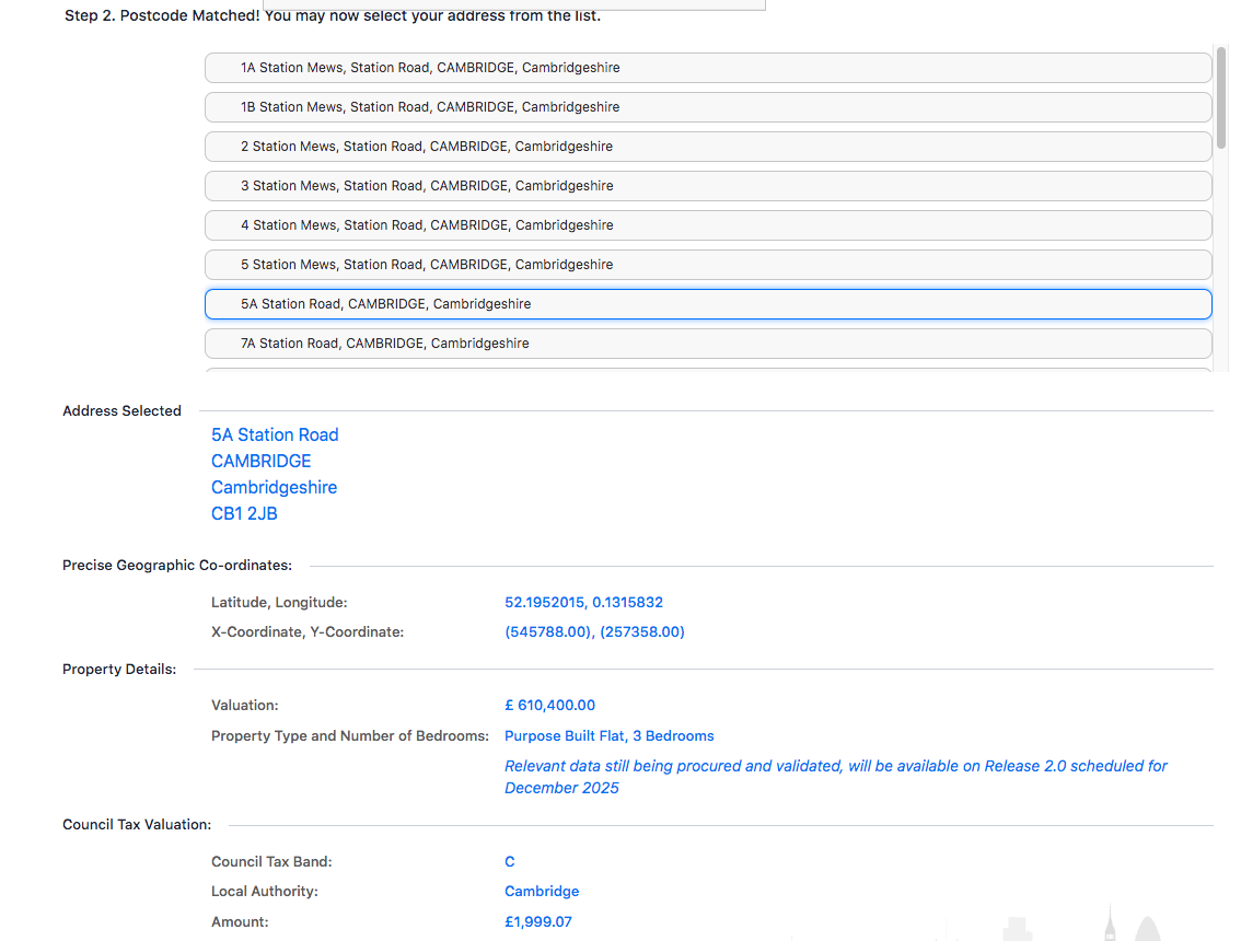 When you utilize the given code snippet, it captures the postcode entered by users on your form and sends it to our system, which in turn delivers a list of addresses associated with that postcode or alerts you if the postcode is invalid. Furthermore, you also have the flexibility to submit a precise address to us, enabling us to furnish you with insights such as property valuation, council tax band, and the number of bedrooms, thus offering a thorough overview of each address. This capability not only enhances data accuracy but also empowers users with valuable information at their fingertips.