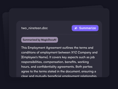 Effortlessly categorize your documents in moments using our smart labeling system. Our innovative technology allows for rapid file organization, making it easier than ever to keep track of your paperwork. With MagicDocs, you can efficiently organize, rename, summarize, and extract crucial information from any document, solidifying its status as your reliable, AI-powered solution for streamlined document management. In just seconds, MagicDocs delivers concise summaries of lengthy texts, allowing you to save precious time. You can quickly create document summaries using the capabilities of MagicDocs AI, perfect for both personal use and team projects. The tool simplifies the collection and storage of documents, accommodating both solo users and partners alike. Real-time updates guarantee that any modifications made by teammates ensure everyone stays on the same page throughout the entire process. Our top priority is data security; we promise that your information will not be used for training, thereby upholding client privacy and setting a new standard for protection. With MagicDocs, you can concentrate on your tasks without the burden of data security concerns, giving you peace of mind while you work. Additionally, our user-friendly interface makes it accessible for individuals of all tech-savviness levels, ensuring that everyone can benefit from enhanced document management.