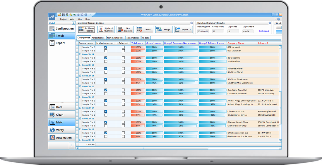 * Leverage built-in phonetic and fuzzy match algorithms to efficiently eliminate duplicate records, saving hours of manual effort.