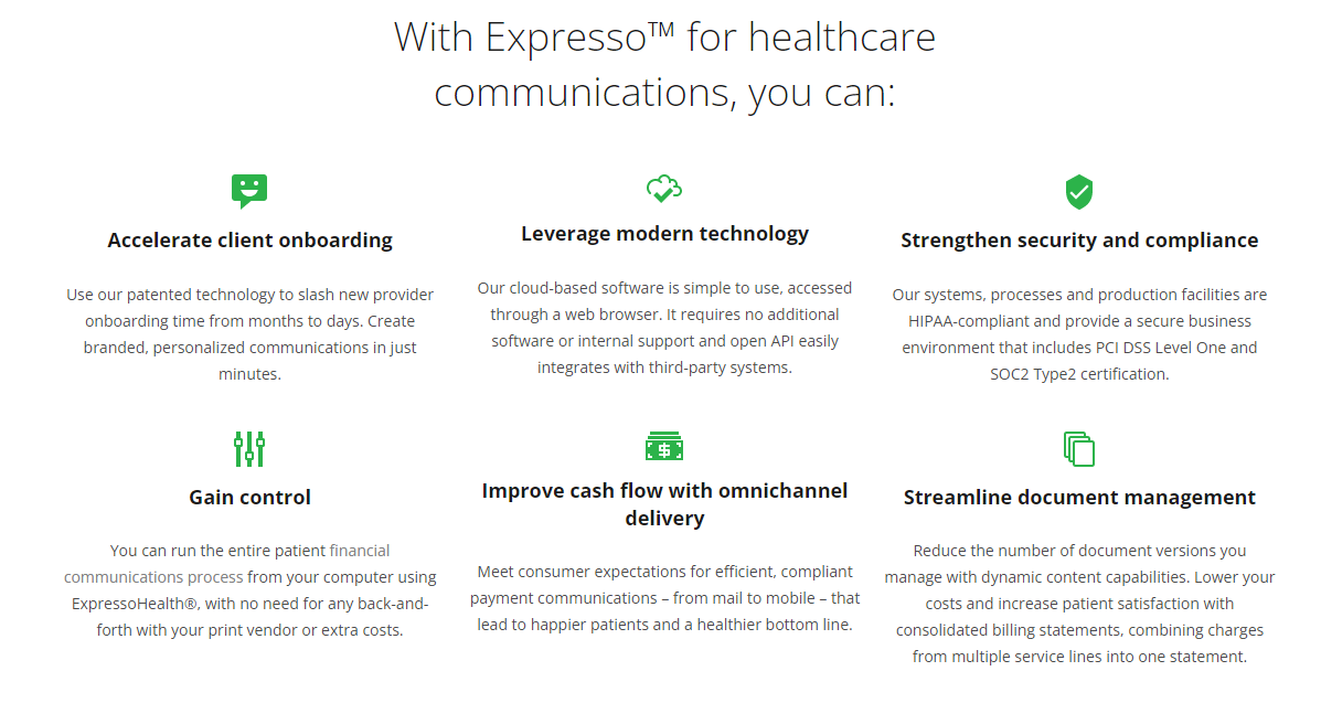 Transform patient engagement and financial results with an innovative communication solution for healthcare. As patients increasingly turn to retail settings for care and make use of smartphones for their billing needs, the dynamics of their interactions with healthcare providers are changing dramatically. Expresso® communications management software empowers healthcare providers and revenue cycle management companies to seamlessly navigate these changes through its intuitive cloud-based platform designed for creating and managing patient communications. This system, which adheres to HIPAA regulations, not only streamlines the onboarding process for new facilities but also enhances oversight and management of document production, simplifying compliance with regulatory standards. By embracing this cutting-edge tool, healthcare organizations can not only boost operational efficiency but also cultivate deeper connections with their patients, ultimately leading to improved care experiences. Additionally, this solution positions healthcare entities to stay ahead in a rapidly evolving landscape.