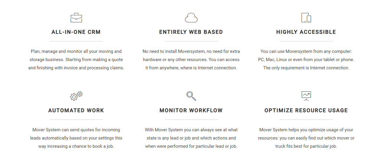 Manage, coordinate, and assess all elements of your moving and storage business, beginning with the generation of quotes and ending with invoicing and claims processing. There's no need to install Moversystem or buy extra hardware; it is accessible from anywhere with an internet connection. Whether you're using a PC, Mac, Linux, or a mobile device, as long as you have internet access, you can easily utilize Moversystem. The platform is capable of automatically producing quotes for incoming requests based on your established parameters, significantly increasing your chances of winning jobs. Moreover, Moversystem enables you to monitor the status of each lead or job, providing comprehensive insights into the steps taken and their timing. It also assists in optimizing resource allocation by identifying the best mover or truck for each assignment. We highly value continuous feedback from our users to improve the software consistently, ensuring it adapts to their changing requirements. By committing to regular updates, we guarantee that Moversystem will consistently meet the latest industry standards and practices, enhancing your operational efficiency. The adaptability of the platform allows it to serve your business better as it grows and evolves over time.