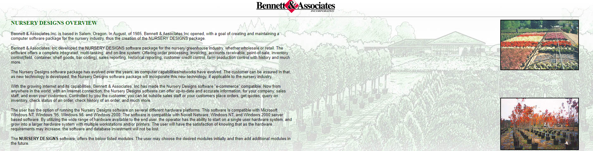Established in August 1985 in Salem, Oregon, Bennett & Associates Inc. set out to create and maintain a robust software solution specifically for the nursery industry, culminating in the introduction of the NURSERY DESIGNS software package. This cutting-edge software caters to both wholesale and retail divisions within the nursery and greenhouse market. It offers a comprehensive, integrated system that facilitates various tasks and online features. Among its essential functionalities are order processing, invoicing, accounts receivable management, point-of-sale solutions, and inventory oversight, which encompasses field, container, shelf goods, and barcoding systems. Additionally, it includes features for sales and historical reporting, customer credit management, and farm production oversight while tracking historical data. Over the years, NURSERY DESIGNS has evolved and enhanced its capabilities to keep pace with technological advancements and networking developments, thereby ensuring ongoing relevance and efficacy for its users. This ongoing enhancement not only demonstrates the firm's dedication to its clientele but also highlights its proactive stance in adapting to the ever-changing landscape of the nursery industry.
