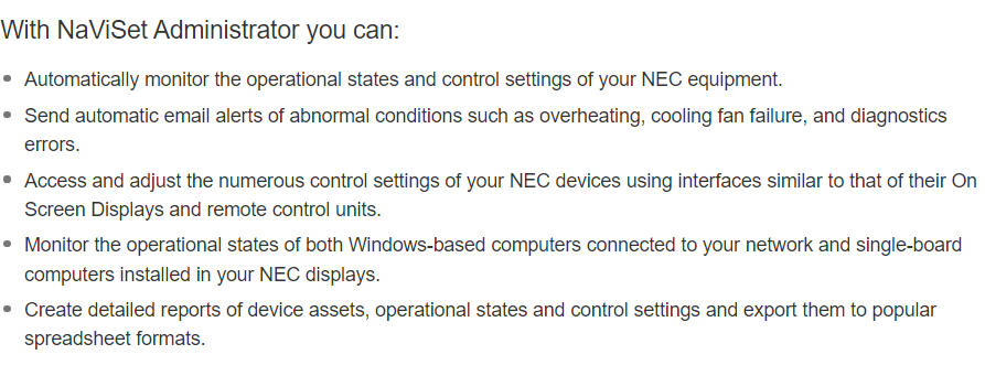 Effortlessly manage the operational parameters and settings of your NEC devices with ease. You will receive automatic email alerts for any anomalies, such as overheating, fan failures, and diagnostic issues. Access and adjust various configurations on your NEC equipment through intuitive interfaces similar to On Screen Displays and remote controls. In addition, monitor the operational health of both Windows-based computers that are part of your network and single-board computers integrated into your NEC displays. Create detailed reports that encompass device assets, operational health, and configuration details, which can be exported to popular spreadsheet formats for further analysis and documentation. This efficient management system not only improves device oversight but also facilitates prompt action in response to emerging challenges, thus enhancing overall productivity. By utilizing this approach, you can maximize the reliability and performance of your NEC devices, ensuring they operate at their best.