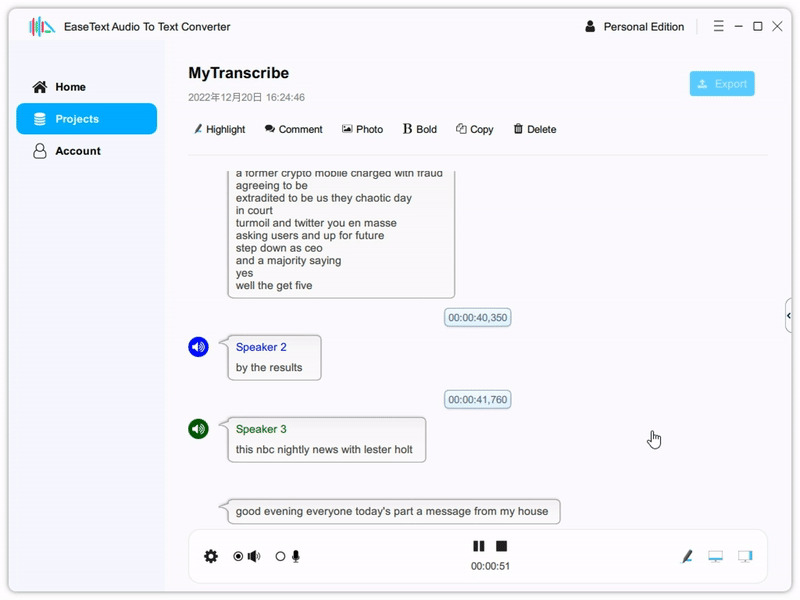 5. Versatile saving options for text transcripts, including PDF, HTML, and TXT.