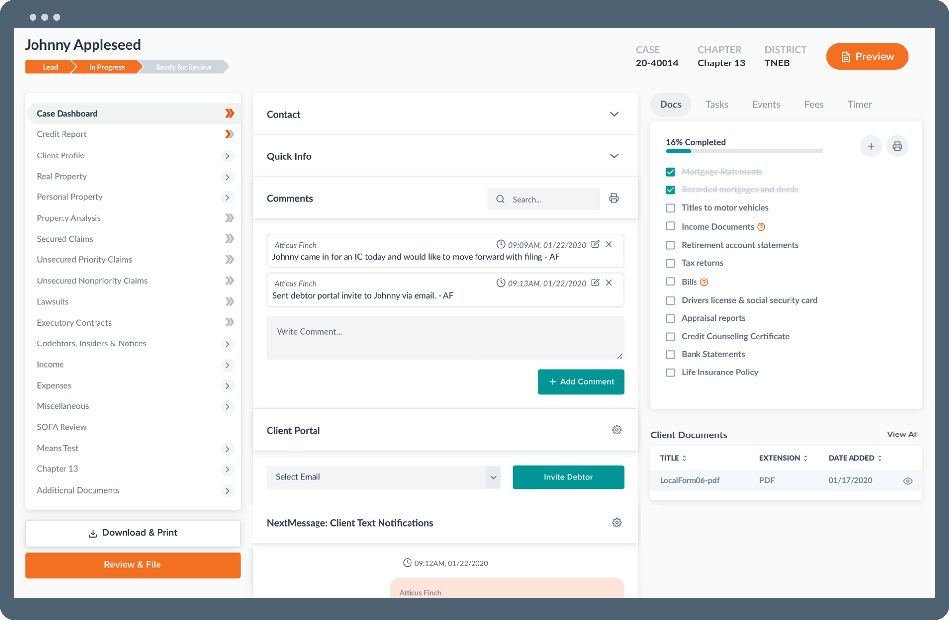 NextChapter provides a cloud-based solution designed to enhance your legal practice by streamlining the preparation, management, and filing of bankruptcy cases. Whether you prefer to work from the comfort of your home or while lounging in a hammock by the beach, you can securely access client files from any device and browser at any time. By eliminating the need for redundant data entry, clarifying complex orders, and implementing real-time validation, you can simplify the bankruptcy filing process for your clients. This allows you to reclaim precious time to invest back into your practice. Navigating the intricate details of bankruptcy paperwork becomes much easier with our assistance. Additionally, NextChapter offers a comprehensive suite of products and services to support you from the initial client intake and consultation all the way to the final bankruptcy discharge, ensuring a smooth transition into the next stage of your legal journey. Our platform is designed to empower lawyers, making complex processes straightforward and manageable.