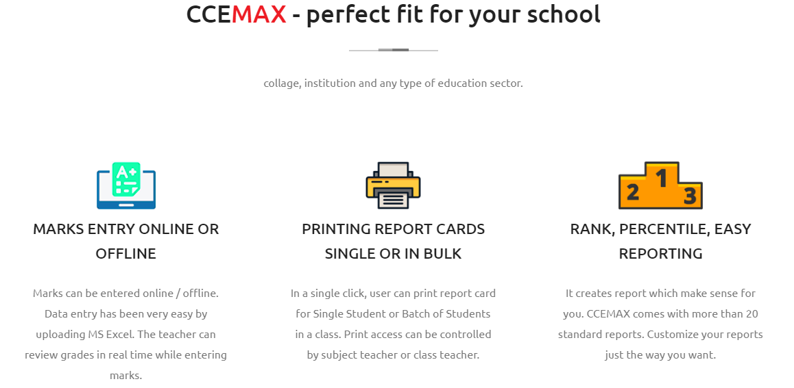 Marks can be entered both online and offline through a straightforward process that facilitates data uploads via MS Excel. Educators enjoy the benefit of being able to review and adjust grades in real-time as they enter the marks. With a single click, users can create report cards for individual students or entire classes, with print permissions managed by either the subject teacher or the class instructor. The system generates customized reports according to your specifications, and CCEMAX provides more than 20 standard report templates for convenience. Moreover, there is an option to modify reports to meet specific requirements. Automatic assessments for both Scholastic and Co-Scholastic areas are calculated based on the grading scale selected by the school, which can be adjusted as necessary. We also offer a wizard that allows for the effortless integration of CCEMAX with the school's website, giving parents the ability to view their child's report cards online. To safeguard against data loss due to computer errors, daily backups are securely stored in the cloud, which offers reassurance in the event of lost report cards. Simply logging into CCEMAX enables the reprinting of any required documents, enhancing overall convenience. In addition, the system features a user-friendly interface that allows for swift navigation and easy access to crucial functionalities, making it an indispensable resource for contemporary educational settings. The emphasis on accessibility and ease of use ensures that both teachers and parents can stay engaged in the academic progress of students.
