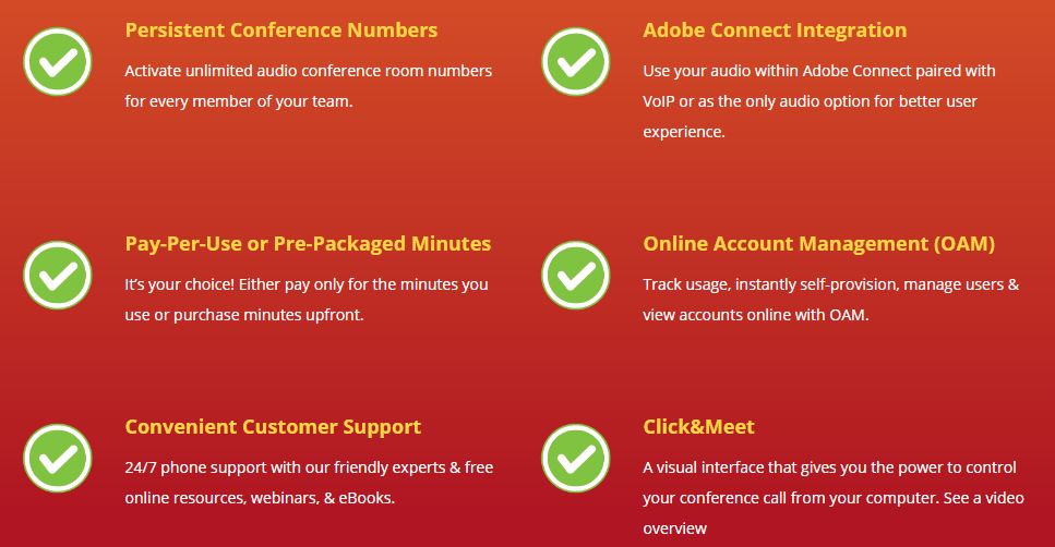Our state-of-the-art audio solution fuses conventional audio conferencing with flawless integration into Adobe Connect, all while providing a reliable and cost-effective service that includes free access to Click&Meet and Online Account Management (OAM). AudioOne emerges as the leading choice for advanced audio conferencing, boasting a user-friendly, secure, and entirely customizable platform. Each team member can activate unlimited audio conference room numbers, offering versatile audio usage—whether through VoIP integration in Adobe Connect or as a standalone feature to enrich the overall experience. Users can choose to be billed only for the minutes they utilize or decide on upfront purchases of minutes for added convenience. With OAM, tracking usage, managing users, and overseeing accounts online is a straightforward process. Our dedicated phone support is available 24/7, supplemented by a plethora of complimentary online resources, webinars, and eBooks to enhance your experience. The platform's intuitive visual interface allows you to manage your conference calls effortlessly from your computer, ensuring a seamless and effective conferencing experience for all attendees. By adopting our groundbreaking audio solutions, you are set to transform the way you conduct conference calls, making them more efficient and user-centric.