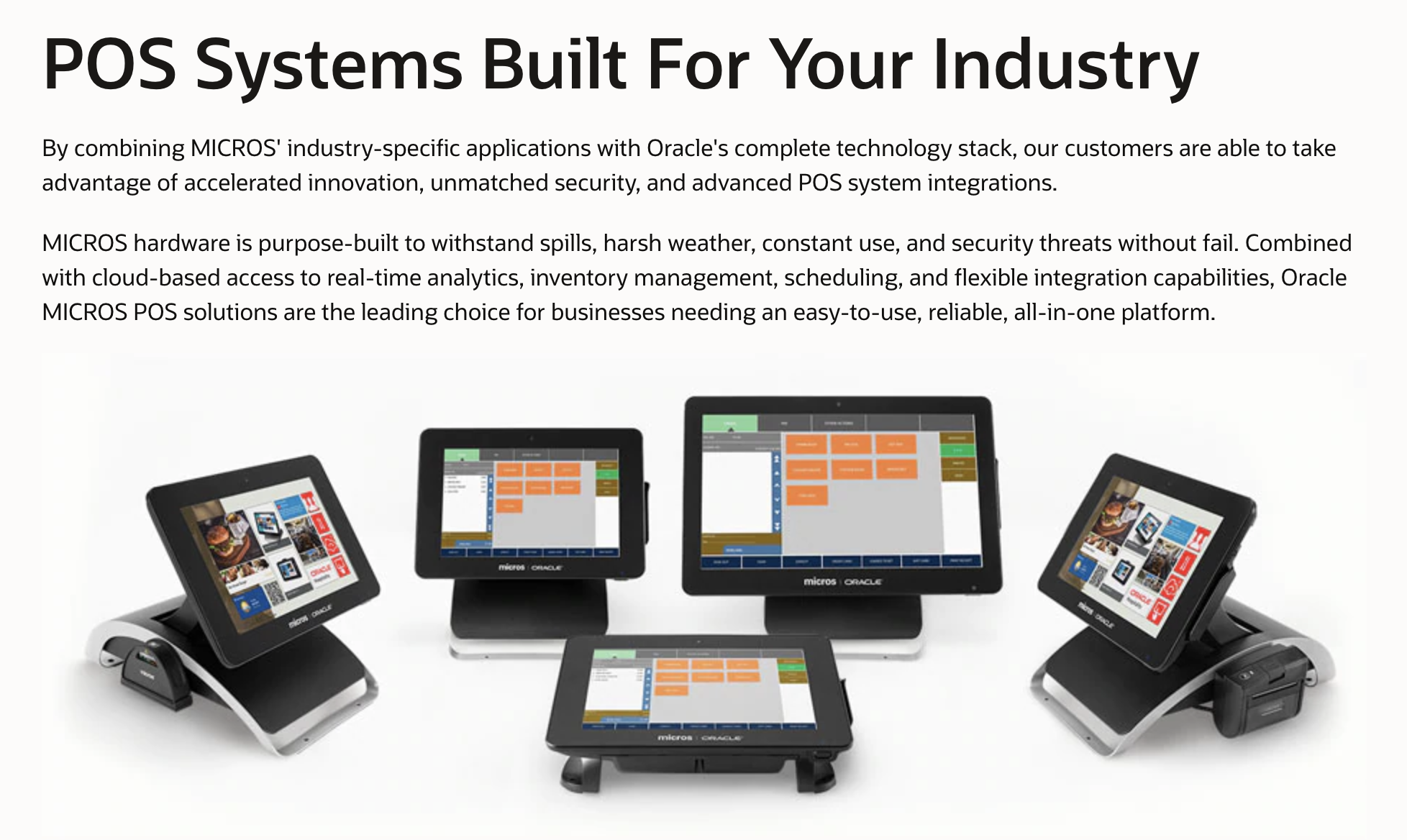 Oracle MICROS provides reliable, secure, and highly efficient point of sale (POS) systems tailored for a wide array of industries, including but not limited to restaurants, hotels, resorts, casinos, stadiums, arenas, cruise ships, transportation hubs, and retail spaces globally. With a remarkable 40-year history in the POS sector, the company has established itself as a leading provider of both cloud-based and on-premise POS solutions, delivering consultation and support services to clients across more than 180 nations. By integrating MICROS' specialized applications with Oracle's extensive technology suite, customers benefit from enhanced innovation, superior security features, and advanced integrative systems that meet their POS requirements. The hardware offered by MICROS is engineered to withstand spills, harsh weather conditions, continuous use, and potential security vulnerabilities, making it exceptionally durable. Furthermore, the cloud-based capabilities provide real-time analytics, inventory management, scheduling, and adaptable integration options, solidifying Oracle MICROS POS solutions as the top choice for enterprises seeking a resilient and flexible system. This unique blend of robustness and cutting-edge technology not only elevates Oracle MICROS' standing but also ensures that it remains at the forefront of the evolving point-of-sale industry. As businesses increasingly demand reliable systems that can adapt to changing environments, Oracle MICROS continues to innovate and refine its offerings to meet these needs.