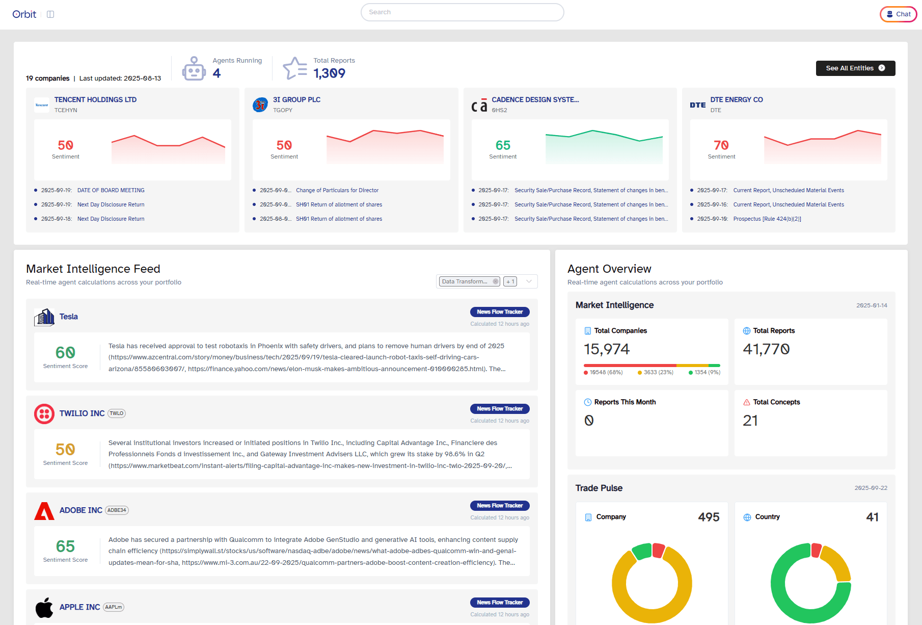 Orbit is an advanced financial intelligence platform powered by artificial intelligence, specifically engineered to transform both unstructured and structured financial information into accurate, clear, and scalable insights. It integrates a cutting-edge AI Studio with a vast collection of millions of documents pertaining to thousands of companies worldwide, streamlining workflow automation and simplifying complex research tasks. By utilizing sophisticated AI models in conjunction with pre-built analytical tools, Orbit bolsters functions such as competitor intelligence, due diligence, risk management, earnings assessment, investment analysis, and ESG reviews, enabling extensive and detailed analysis. The platform's adaptable architecture includes various elements, such as Orbit Insight to support informed decision-making, AI-enhanced knowledge repositories for vast financial information, and tools designed to effectively standardize and manage a wide range of data sources. Users enjoy features like semantic search capabilities, automated data extraction, the development of customized knowledge bases, and the launch of analytical agents, which provide a holistic approach to financial examination. Furthermore, Orbit is designed with user experience in mind, ensuring accessibility for professionals across all expertise levels, from novices to seasoned experts, making it a valuable asset in the financial landscape.