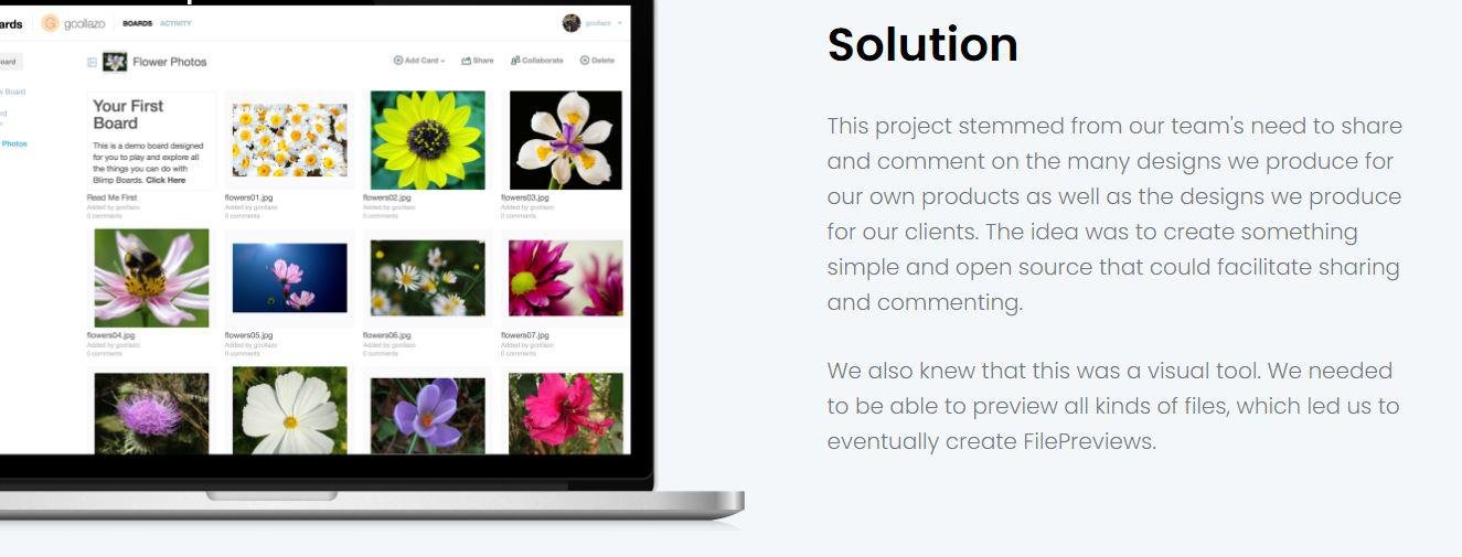 Boards acts as a collaborative visual platform that allows users to efficiently manage, organize, and distribute a variety of files and notes among team members. Whether you're showcasing the latest web design to a client or collecting creative ideas for an upcoming wedding, Boards serves as a comprehensive repository to meet all your requirements. This project was born out of our team's need to share and receive feedback on the numerous designs we produce for both our products and our clients. The goal was to create a simple, open-source tool that would improve the sharing and commenting process. Understanding the demand for a visual interface, we focused on incorporating the ability to preview different file formats, which ultimately inspired the creation of FilePreviews. Boards represents one of our first products in the "single page app" style, featuring a sleek interface that is both quick and intuitive, while also offering a wide range of functionalities. Additionally, it has proven to be an essential resource for teams aiming for effective collaboration on design projects, fostering a more seamless workflow among members. The continuous updates and enhancements ensure that Boards remains aligned with the evolving needs of its users.