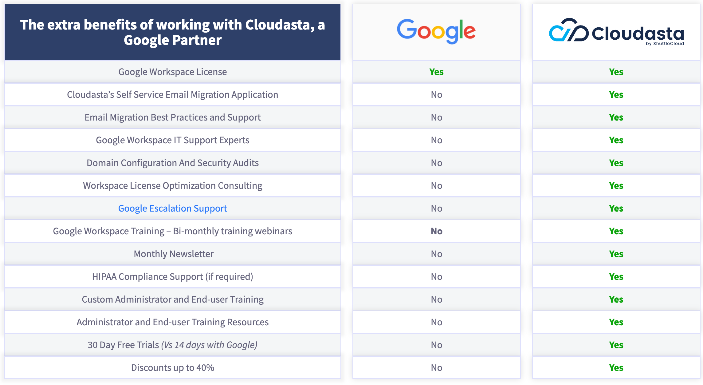 The Cloudasta team, consisting of Google Workspace Specialists, provides not only training but also elevates Google's standard support services, including the management of issue escalations to guarantee smooth operations. By leveraging our expertise, you can fully harness the potential of Google Workspace while witnessing a considerable increase in productivity and efficiency in your workflow. Additionally, our tailored approach ensures that your unique business needs are met, fostering an environment where innovation and collaboration can flourish.