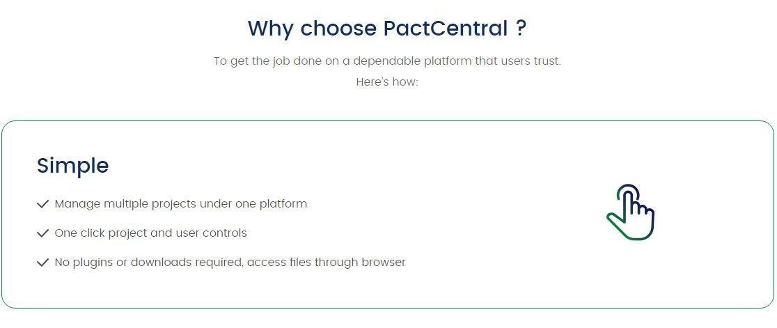 PactCentral provides a dependable virtual data room solution that ensures the secure storage and exchange of sensitive documents across various business environments, including mergers and acquisitions, initial public offerings, fundraising, bankruptcy, board activities, audits, and reporting. From the outset, you can boost your productivity with PactCentral's intuitive interface and attractive pricing model. This cloud-based system allows for the digital storage and sharing of confidential data with external parties globally. By adopting a virtual data room, organizations can eliminate the inefficiencies associated with physical meetings and the tedious exchange of paper documents, which frequently result in delays and challenges in tracking. PactCentral empowers users to oversee multiple projects effortlessly within a single platform, taking advantage of convenient one-click project and user management features. Additionally, there's no requirement for extra plugins or downloads, as files can be easily accessed via a web browser, enhancing operational efficiency for all participants. This contemporary method of document management not only conserves time but also simplifies the complexities often found in traditional processes, making it an indispensable tool for modern businesses. Overall, PactCentral serves as an essential resource for organizations looking to streamline their documentation workflows.