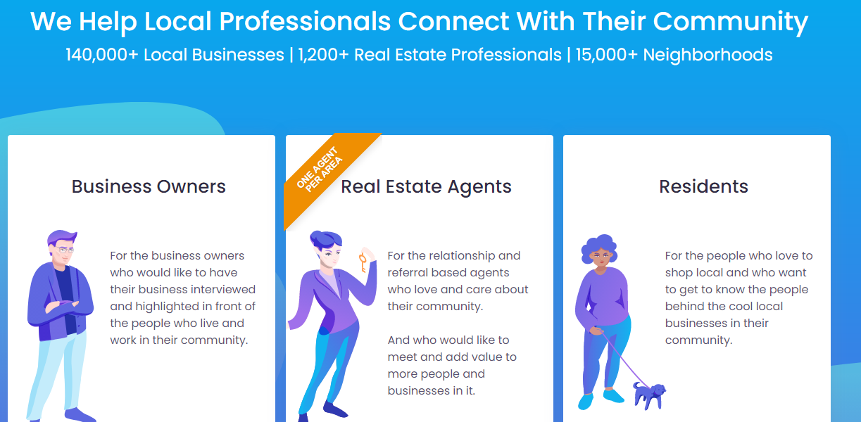 We facilitate connections between local professionals and their communities. Our service is designed for business owners eager to showcase their enterprises through interviews, reaching out to residents and workers in their vicinity. Additionally, we cater to agents who prioritize community engagement and are receptive to referrals, fostering relationships that enrich both their professional network and the community itself. We aim to bridge the gap between consumers and the dynamic individuals behind local businesses, appealing to those who prefer to shop within their neighborhoods. Our innovative platform empowers community-focused real estate agents to establish themselves as trusted local authorities. By partnering with Parkbench.com, these agents can amplify their networks tenfold in just one year, unlocking increased client opportunities and referrals while enjoying the process. Ultimately, our goal is to help real estate professionals distinguish themselves and cultivate expertise in their local markets. This approach not only benefits the agents but also enhances the community's sense of connection and support.