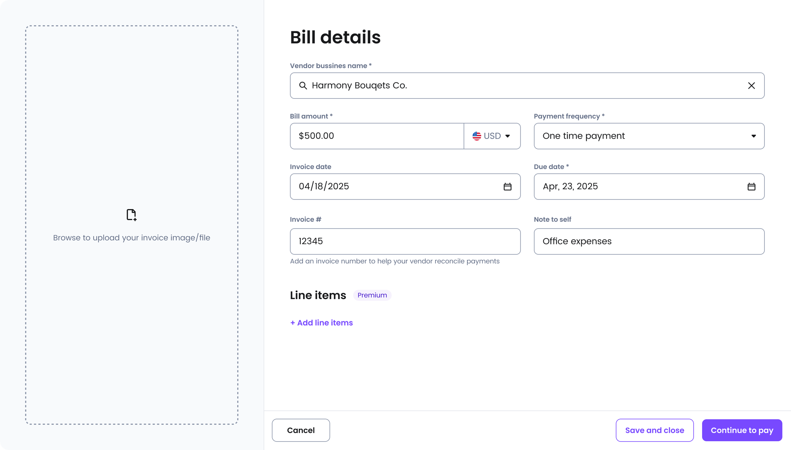With Melio, you’ll get to streamline your day-to-day work. Either input vendor information or bill details manually, upload documents, or take a photo of the invoice for quick processing—it’s incredibly user-friendly. Payments can be scheduled in alignment with your cash flow strategy, and Melio will make those payments happen.