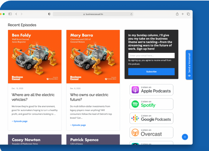 Easily craft a visually appealing and user-friendly podcast website using just your RSS feed. The layout is fully customizable, allowing you to achieve a sleek look with just a few clicks, eliminating the need for coding or technical know-how. Each podcast episode will come with automatically created, search engine optimized pages that work seamlessly with your podcast host's media player. You can also display episode transcripts next to the show notes and design unique pages for each guest, enhancing the overall experience. Your website can be set up in just minutes, with automatic updates whenever a new episode is released. Users have often remarked on how much more user-friendly Podpage is in comparison to platforms like Wordpress. Additionally, you can collect email addresses to build your mailing list, making it easier to communicate directly with your audience. Engaging with your listeners is straightforward; they can quickly email you, leave comments about episodes, or record voicemails that you can include in your show, thereby cultivating a vibrant community centered around your podcast. This ease of use and the myriad features available make it an excellent choice for podcasters looking to enhance their online presence.